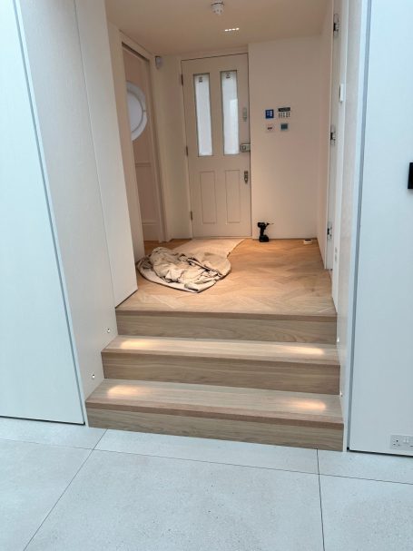 - Integrated brass inlays to stone flooring