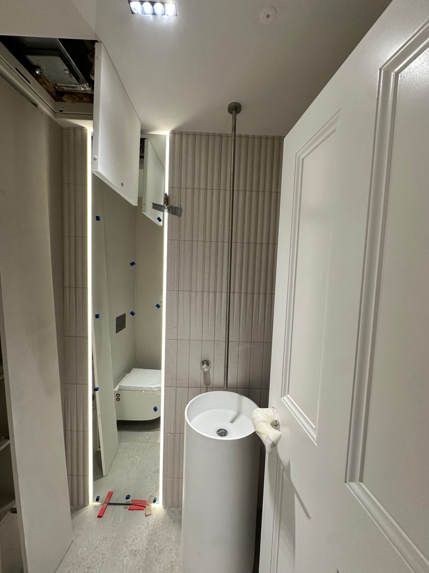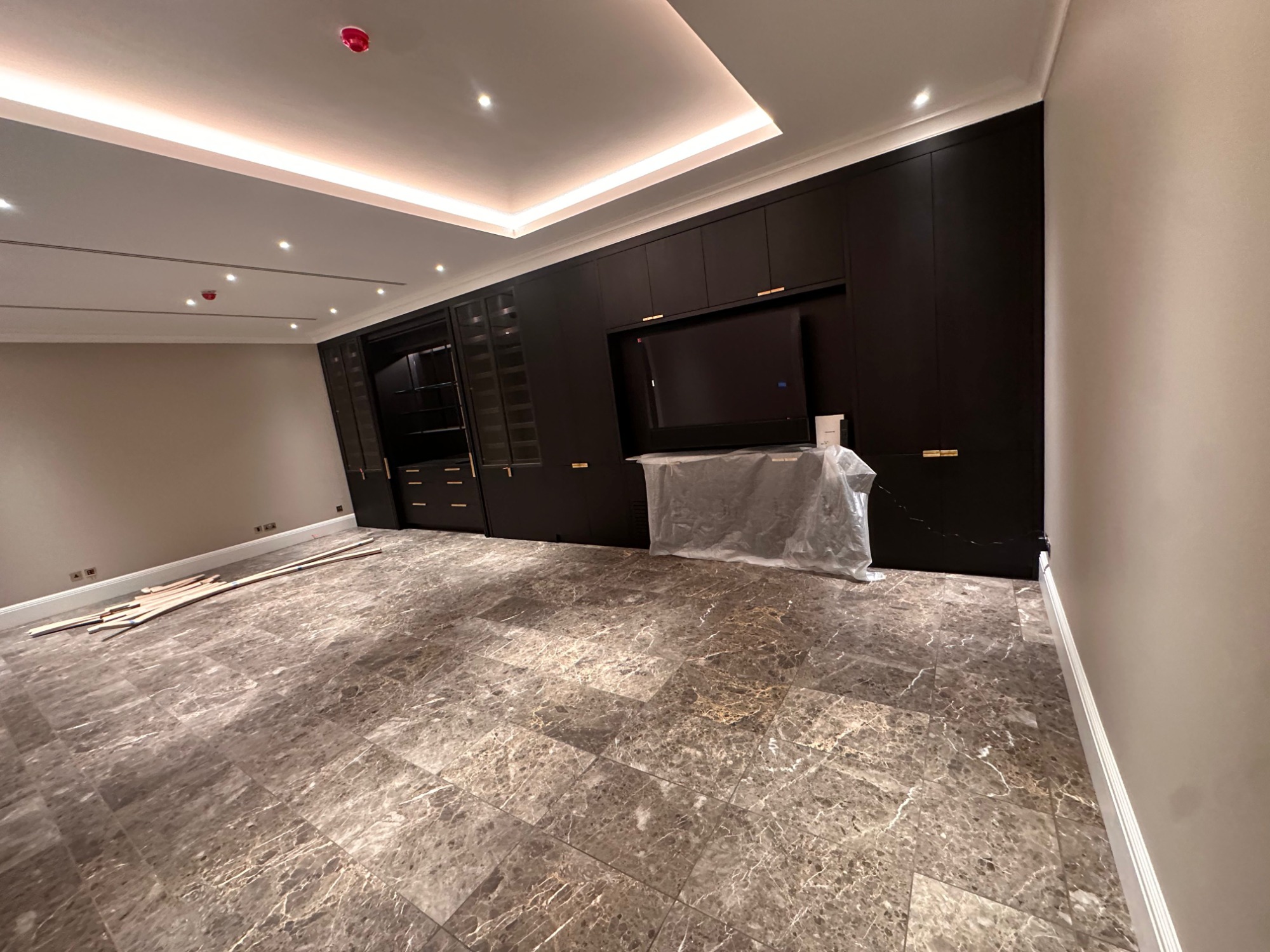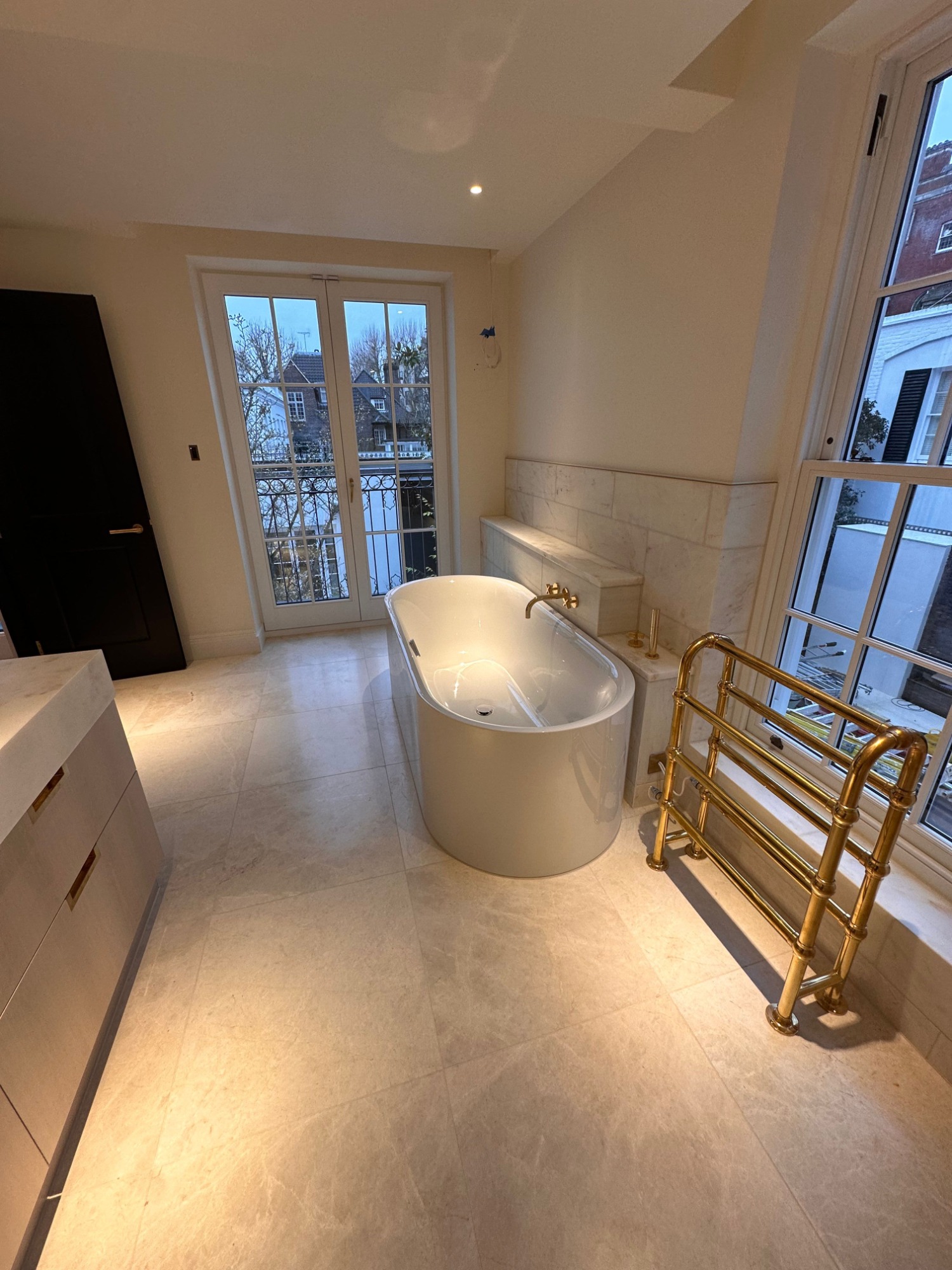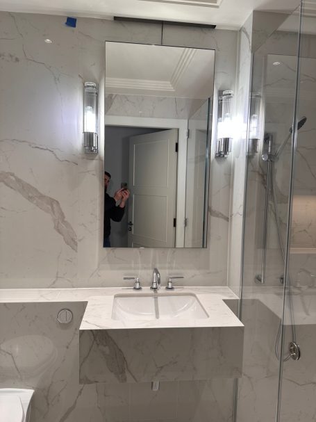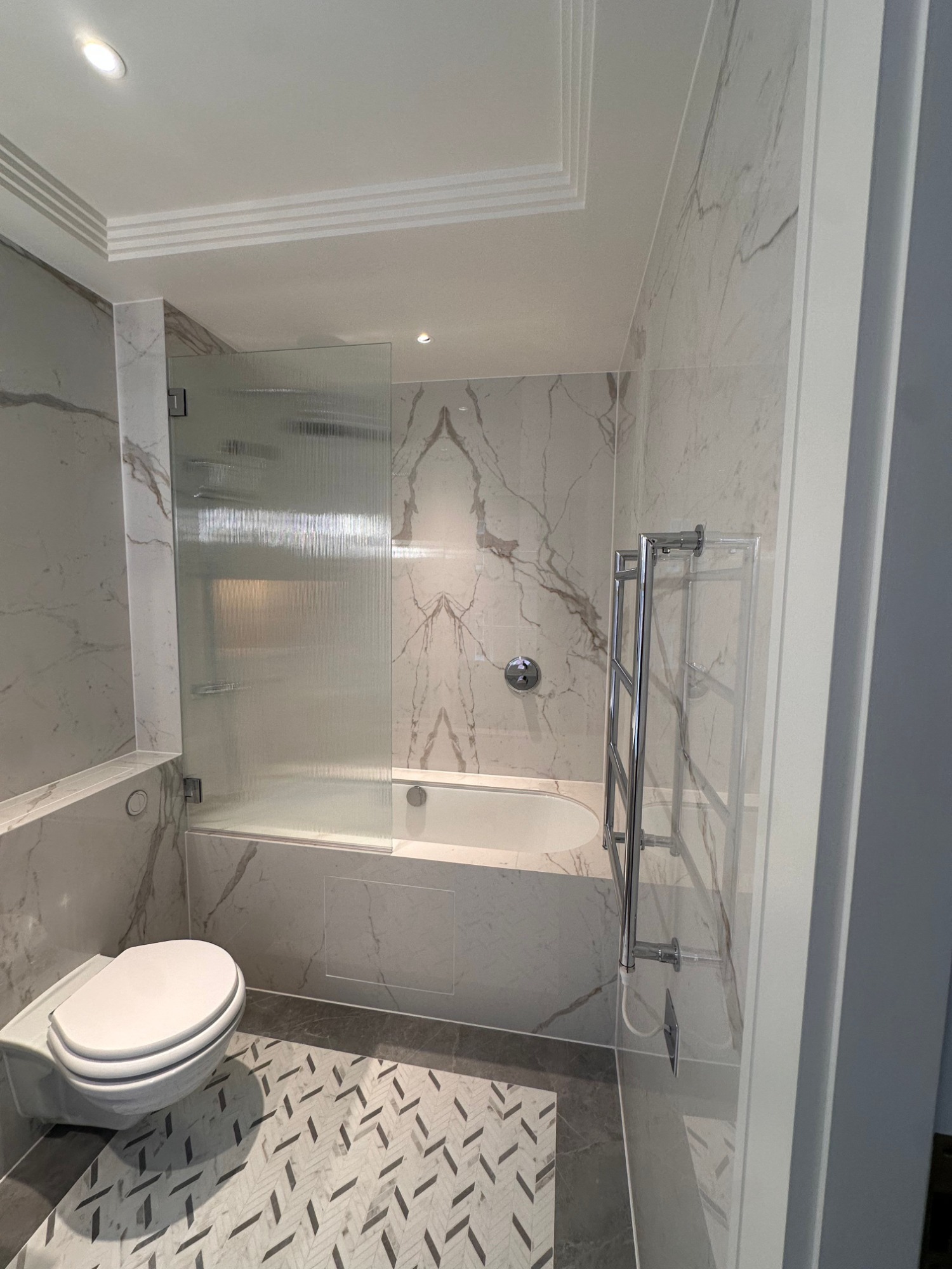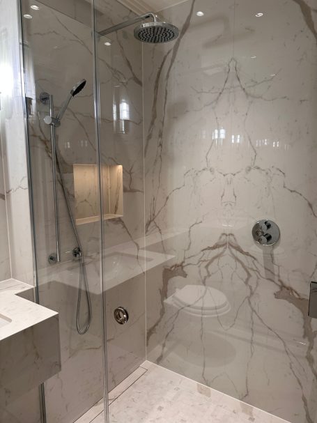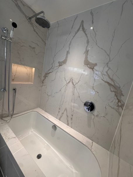 Bespoke stone and large-format porcelain installations for luxury apartments and private residences - book-matched layouts, resin-mitred detailing, and high-performance wet-area waterproofing.