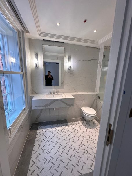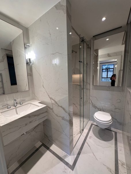 TruEdge Stone & Ceramics delivered bespoke tiling and stone installations across this luxury residential development in Mayfair, comprising six private apartments. The works included bathrooms, WC areas, and communal corridors, executed to a premium residential standard with strong emphasis on symmetry, book-matched layouts, and refined detailing.